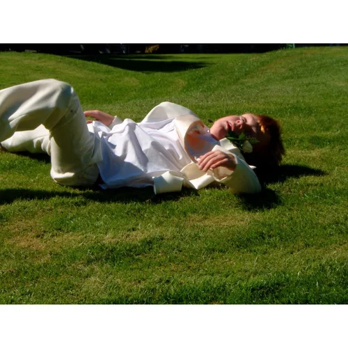 This work comprises a pasting table whose front legs have been cut and hinged, so that the table is kneeling down. On the lower end of the table a number of small randomly collected objects are ‘caught’ in the moment of cascading off; captured in a kind of suspended animation through the simple process of being held by wires. This might be a cornucopia, but it might also be an uncontrollable flood. Under the table is a not quite life-size photo-vinyl banner ‘carpet’ self portrait of the artist lying down. Her mouth is open, as if about to speak or maybe to consume/be consumed by the objects as they fall.